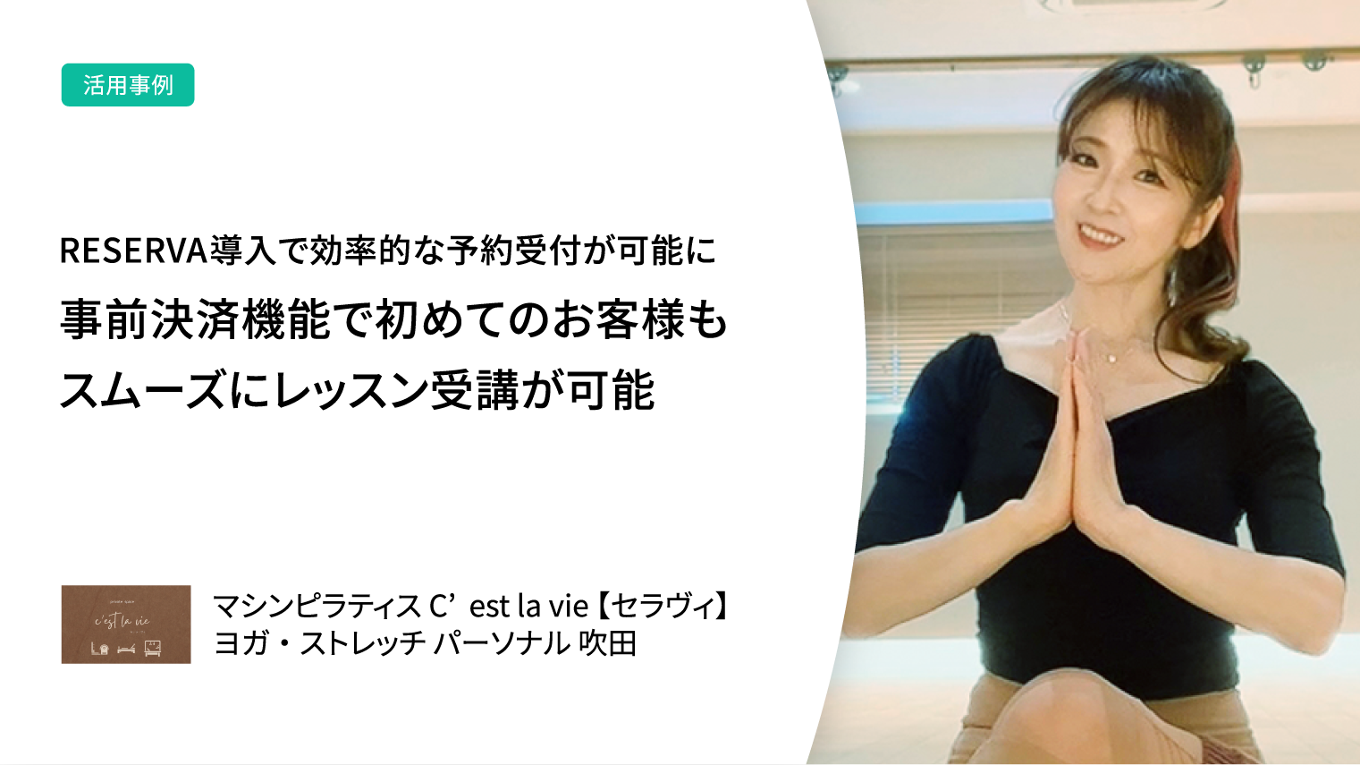 導入事例 事業拡大に合わせて柔軟なプラン設定が可能に|マシンピラティス C’est la vie【セラヴィ】ヨガ・ストレッチ・パーソナル 吹田 一人ひとりに合ったプログラムを組むヨガ・ピラティススタジオRESERVA導入により予約件数が増加!今後は新たなことにも挑戦 今回のインタビューは、大阪府吹田市にある「マシンピラティス C’ 2025/12/25